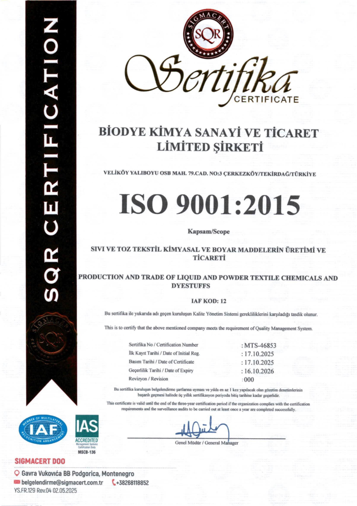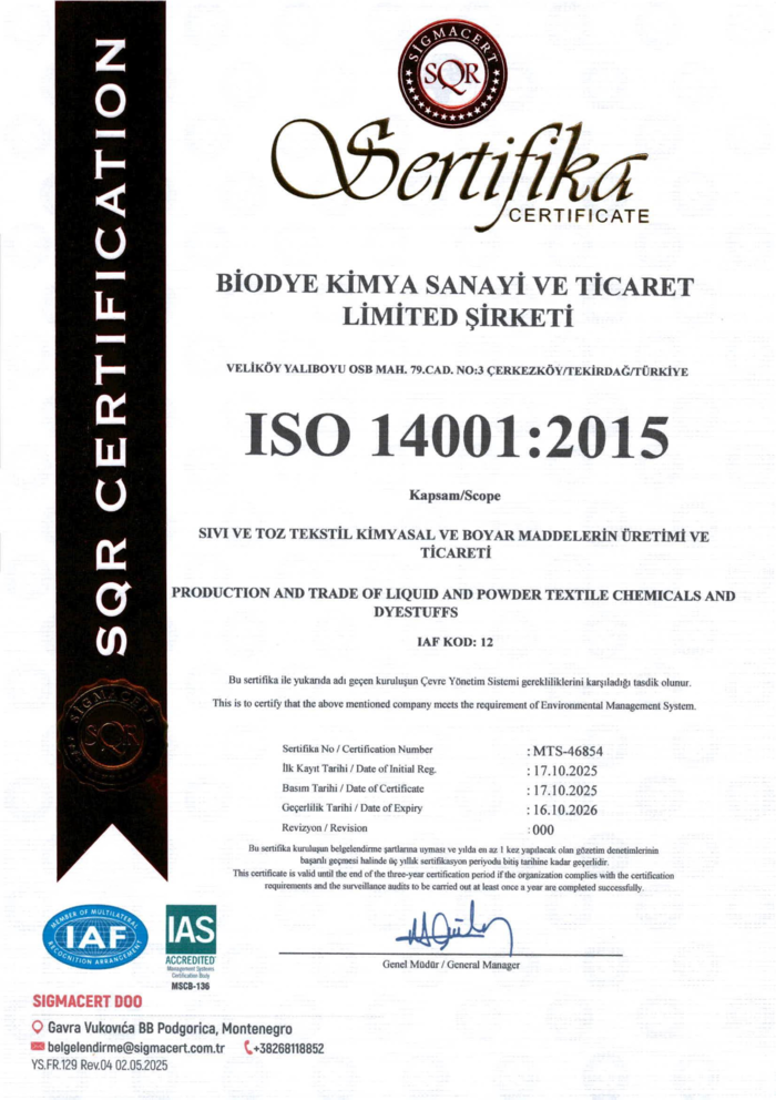 Biodye Kimya Sanayi, üretim süreçlerinde kaliteyi ve çevresel sorumluluğu en üst düzeyde tutmayı ilke edinmiş bir kimya kuruluşu olarak uluslararası standartlara uygunlukta kararlılığını kanıtlamaktadır. ISO 9001 kalite yönetim sistemi ile süreçlerimizin verimliliğini ve müşteri memnuniyetini sürekli geliştirirken, ISO 14001 çevre yönetim sistemi ile doğal kaynakların korunmasına, sürdürülebilir üretim anlayışına ve çevre üzerindeki olası etkilerin en aza indirilmesine odaklanıyoruz. Aynı zamanda iş sağlığı ve güvenliğini öncelik haline getiren ISO 45001 sertifikamız, çalışanlarımız için güvenli ve sağlıklı bir çalışma ortamı sağlama taahhüdümüzü güçlendirmektedir.